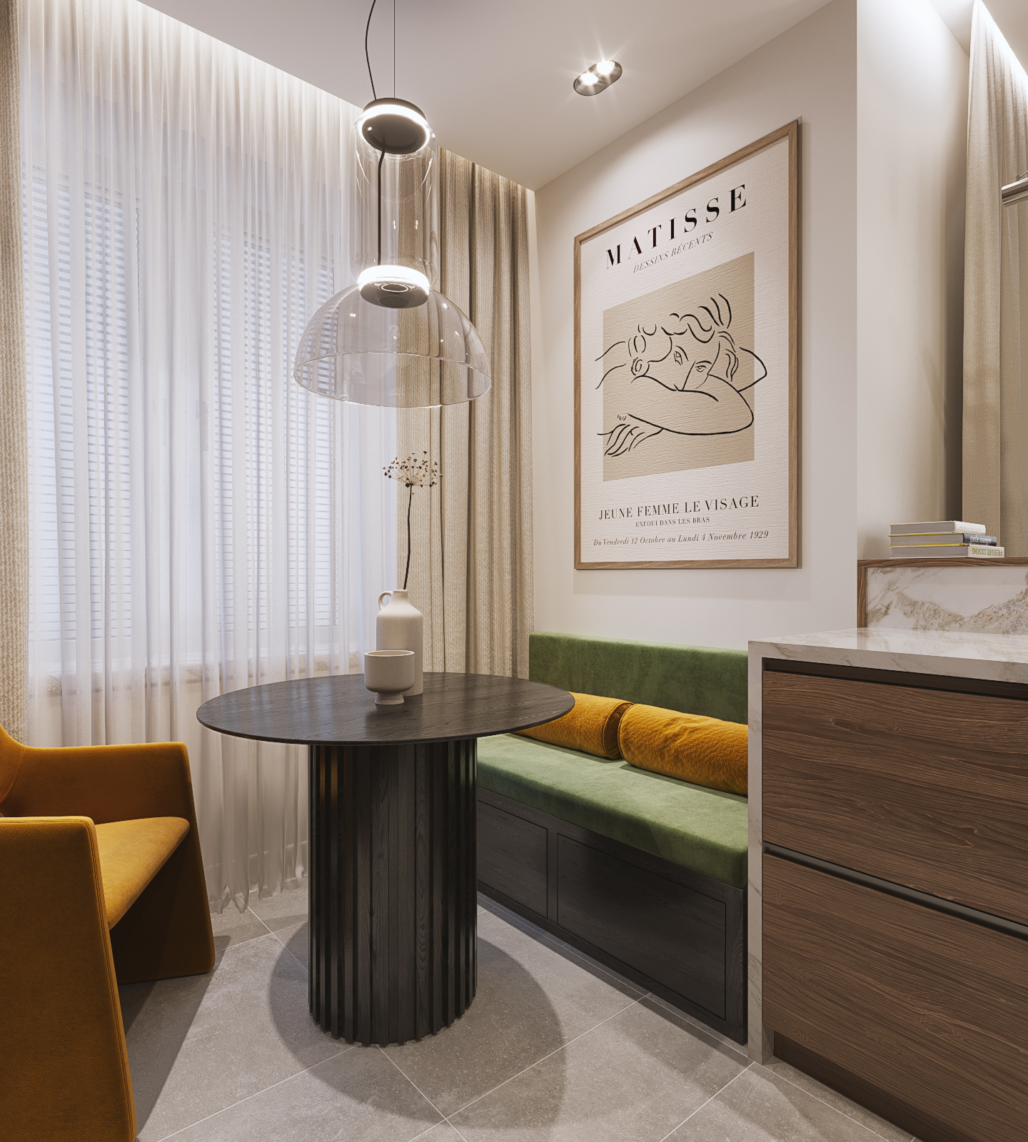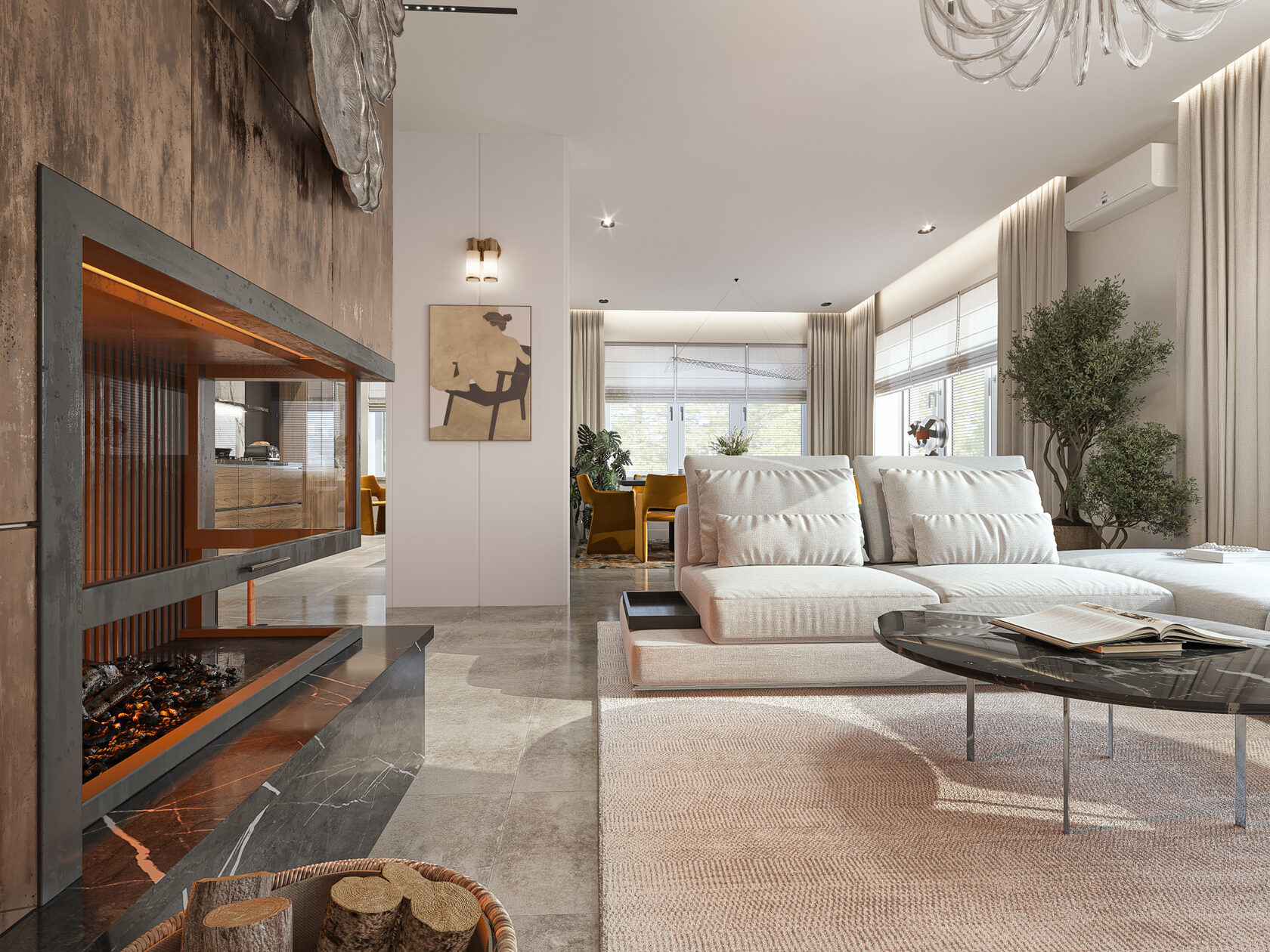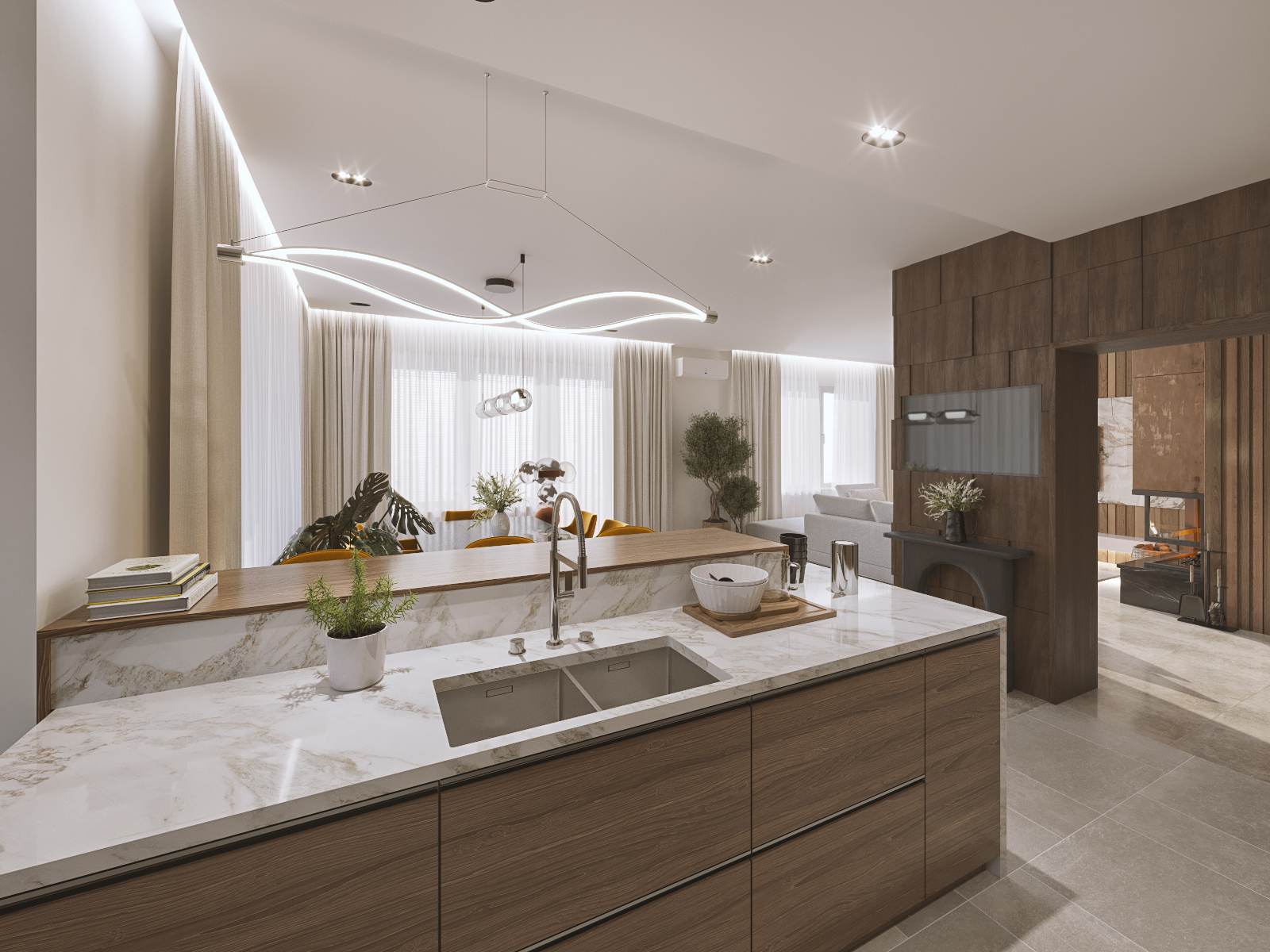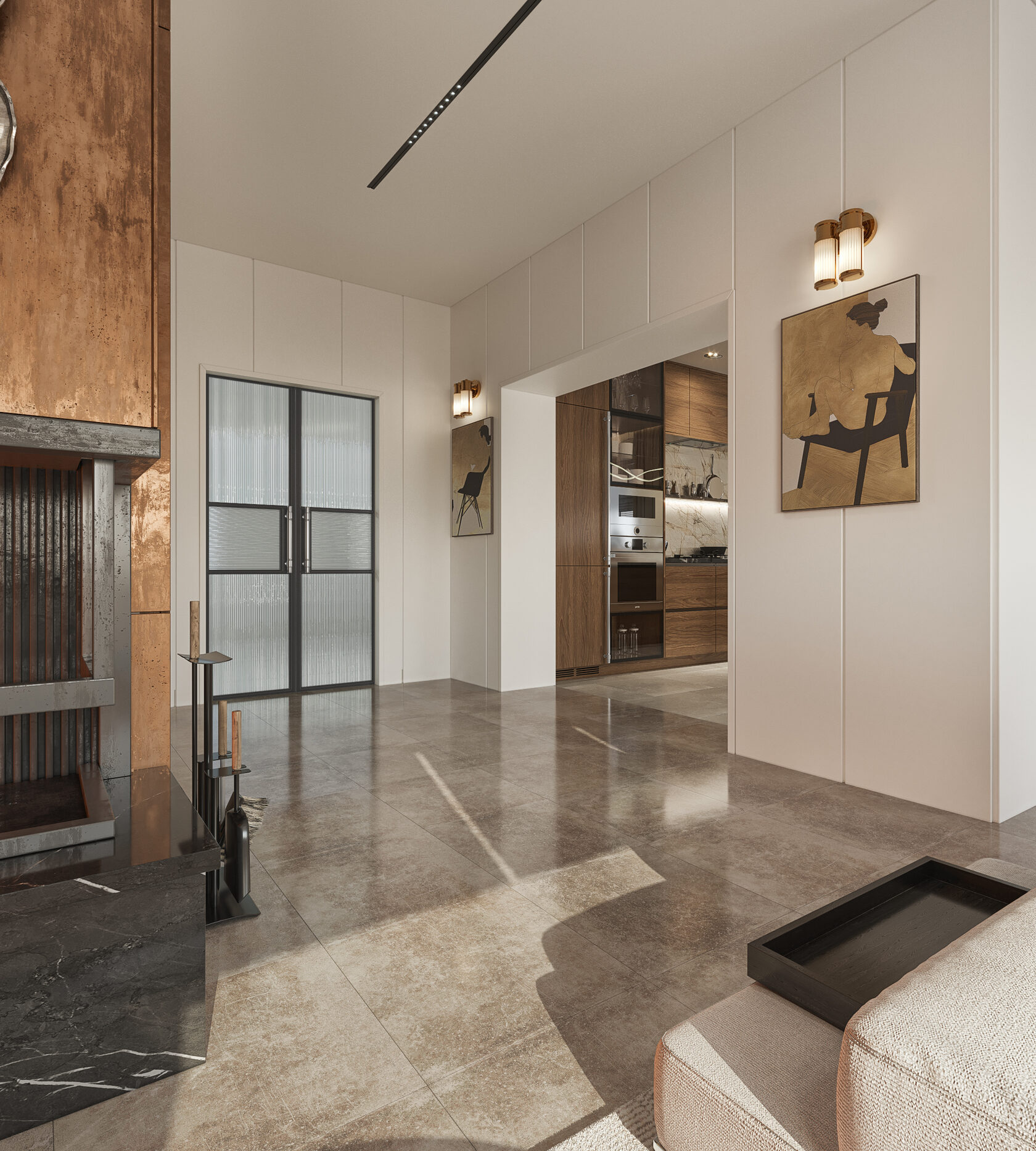 Частный дом в Коломне для семейной пары, которая очень любит устраивать дома встречи с друзьями, посиделки у камина и танцевать. Для хозяина дома обустроили кабинет, он же планируется использоваться как гостевая комната. В кабинете есть эркерное окно, которое диктует нам своей геометрией расположение стола, обеспечивая и хорошую освещенность, и психологический комфорт, тк сидящий за столом будет всегда видеть кто входит в помещение, а так же общаться с гостями или членами семьи, расположившихся на диване. В гостиной разместили большой камин и диван с зоной для просмотра любимых фильмов. Для заказчиков еще очень важно было продумать именно дизайн кухни, так как функционал они уже продумали заранее и даже организовали кладовку за ней, но были сложности в том, как спрятать газовую трубу, замаскировать дверь в кладовку и как обыграть дверные проемы, ведущие из других помещений.
