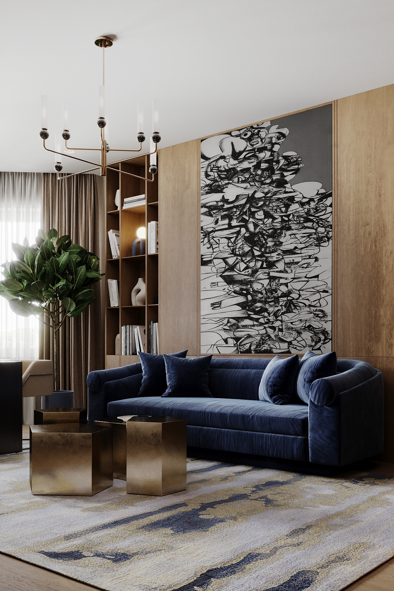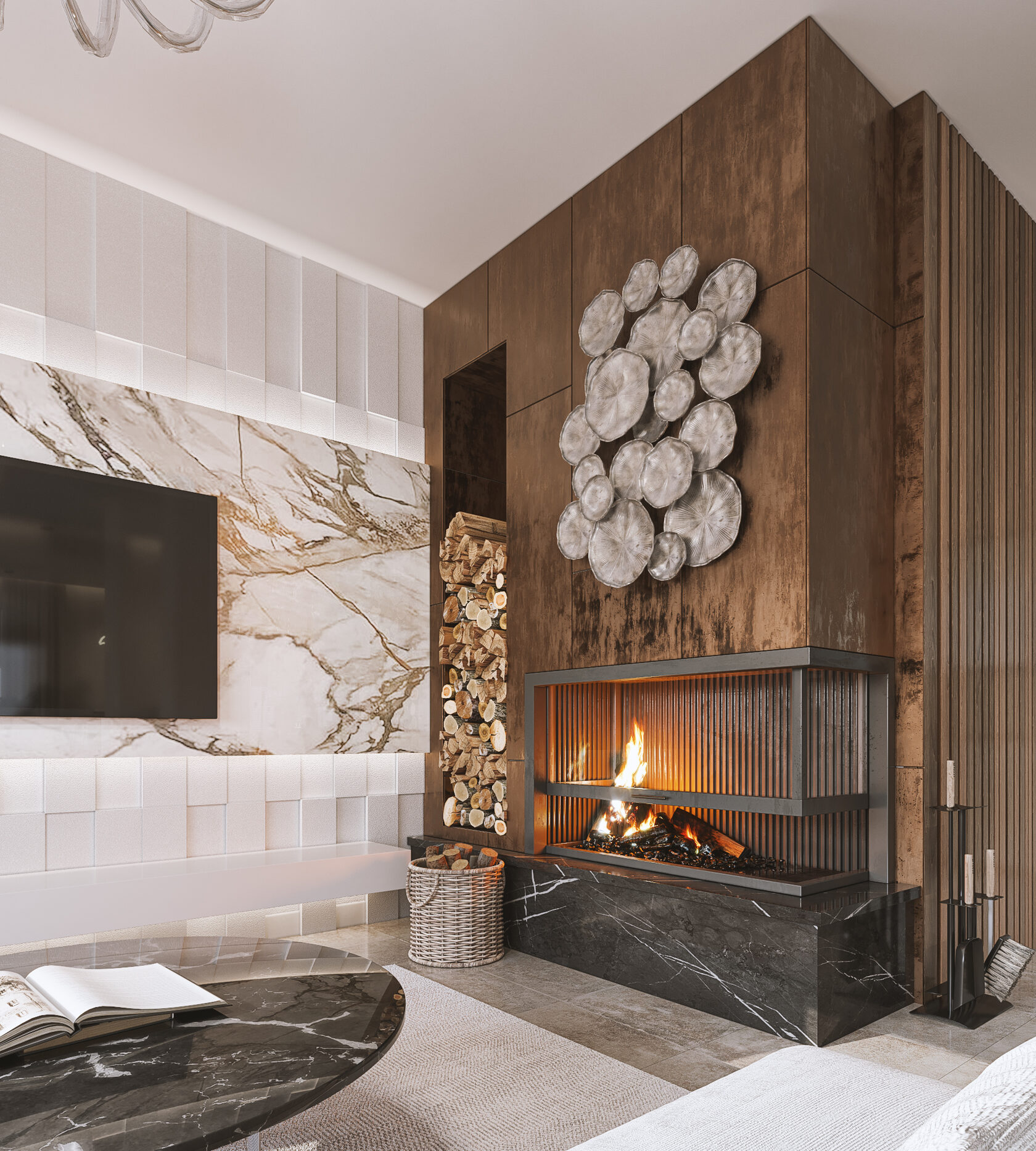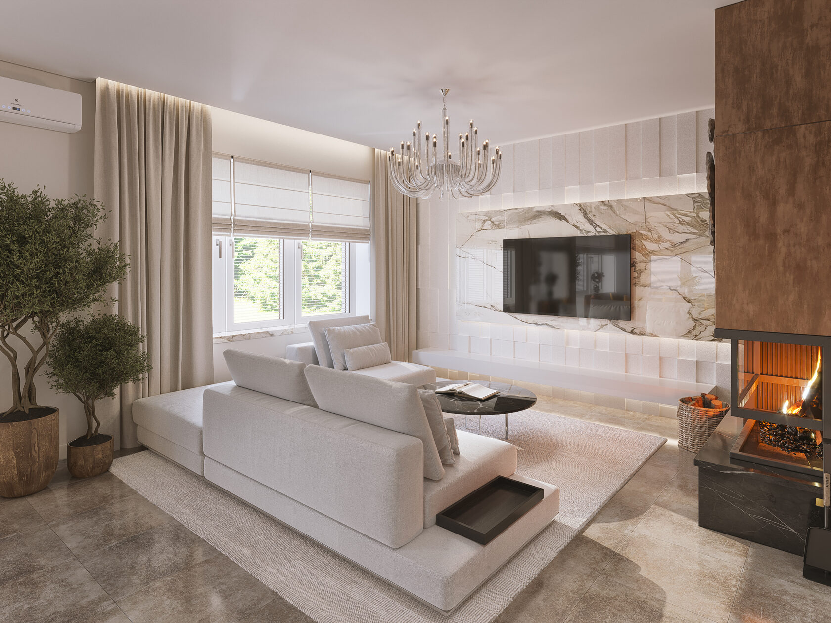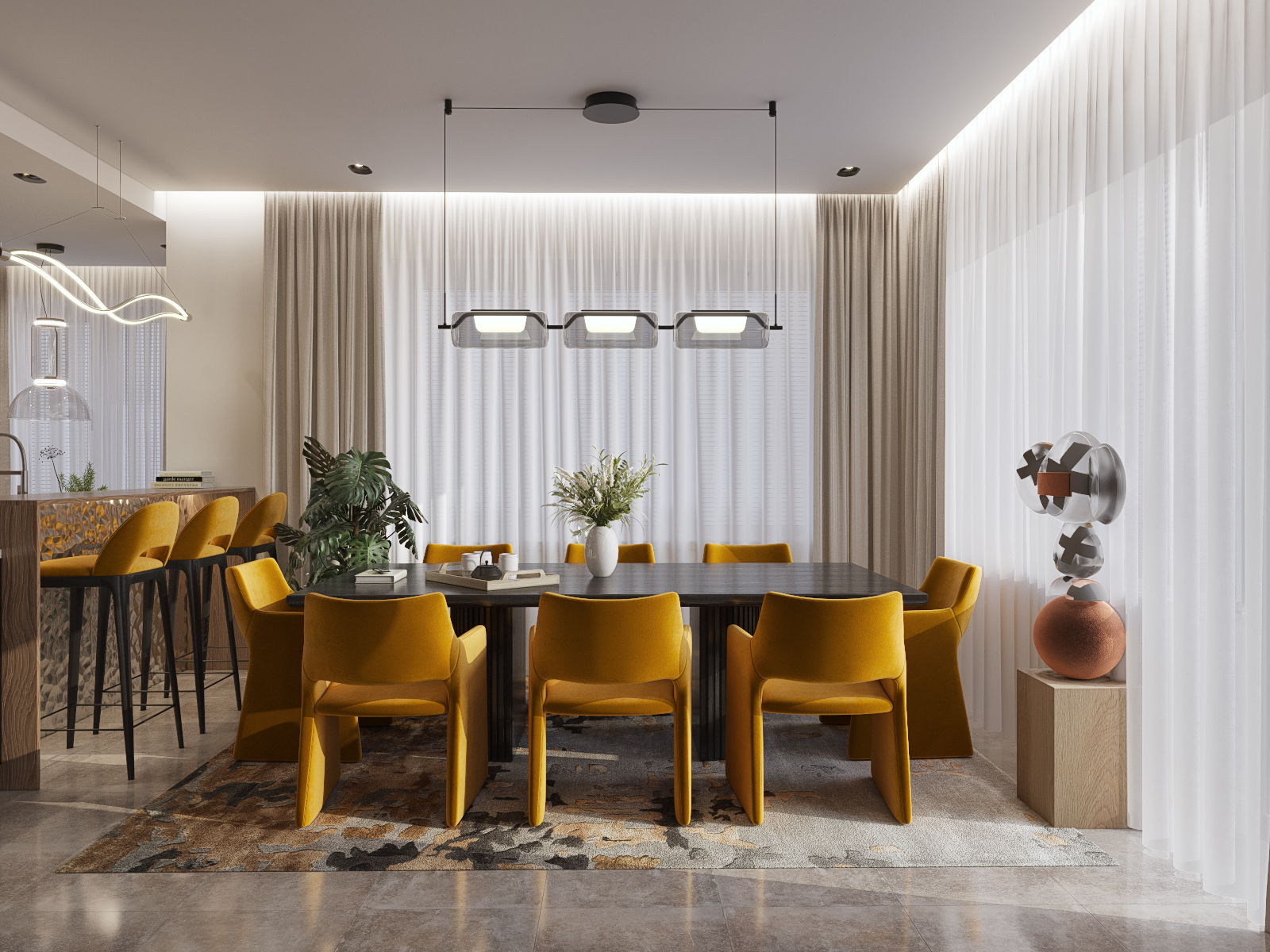 Частный дом в Коломне для семейной пары, которая очень любит устраивать дома встречи с друзьями, посиделки у камина и танцевать. Для хозяина дома обустроили кабинет, он же планируется использоваться как гостевая комната. В кабинете есть эркерное окно, которое диктует нам своей геометрией расположение стола, обеспечивая и хорошую освещенность, и психологический комфорт, тк сидящий за столом будет всегда видеть кто входит в помещение, а так же общаться с гостями или членами семьи, расположившихся на диване. В гостиной разместили большой камин и диван с зоной для просмотра любимых фильмов. Для заказчиков еще очень важно было продумать именно дизайн кухни, так как функционал они уже продумали заранее и даже организовали кладовку за ней, но были сложности в том, как спрятать газовую трубу, замаскировать дверь в кладовку и как обыграть дверные проемы, ведущие из других помещений.