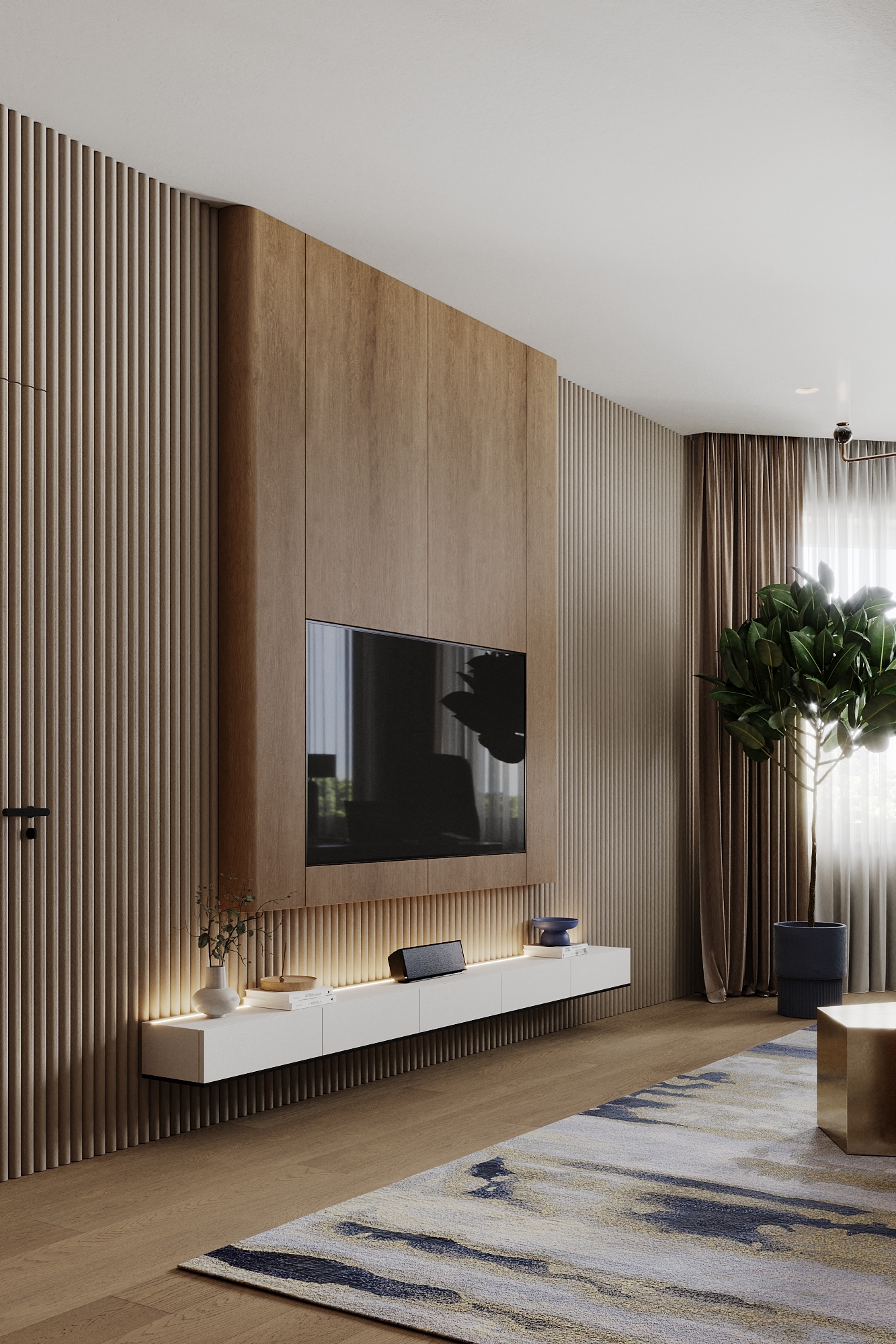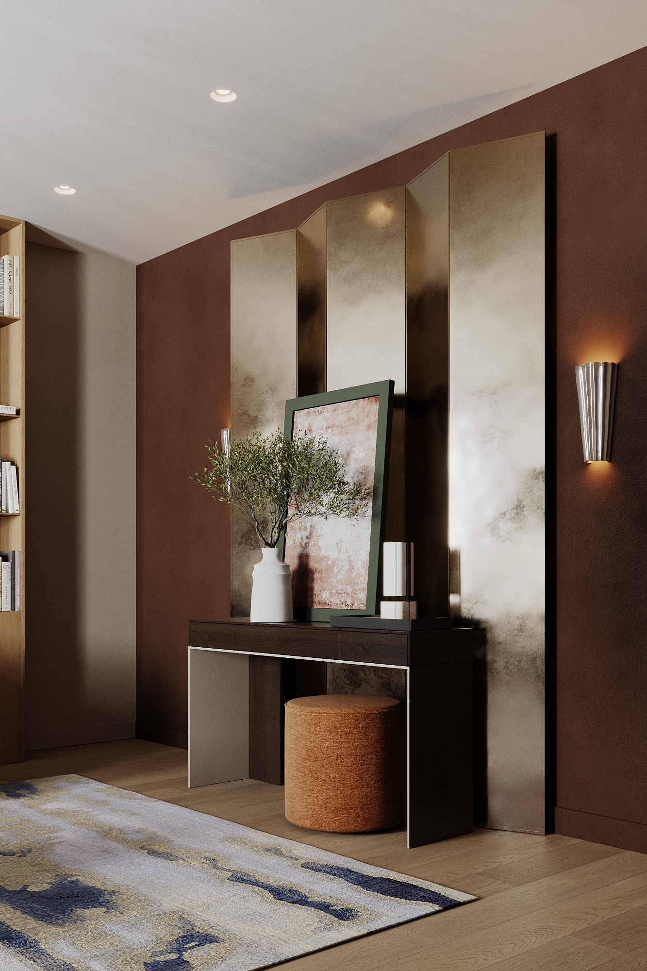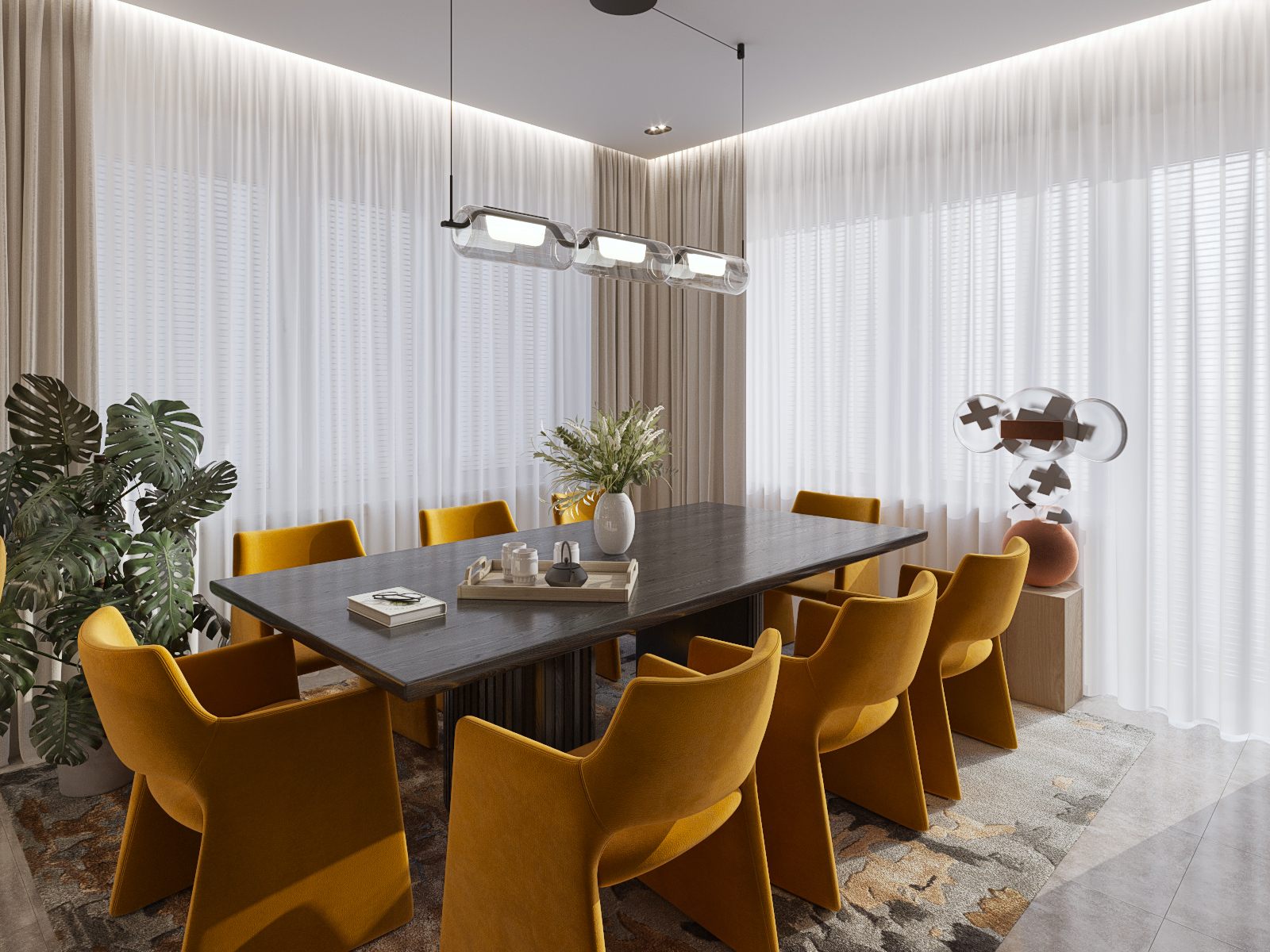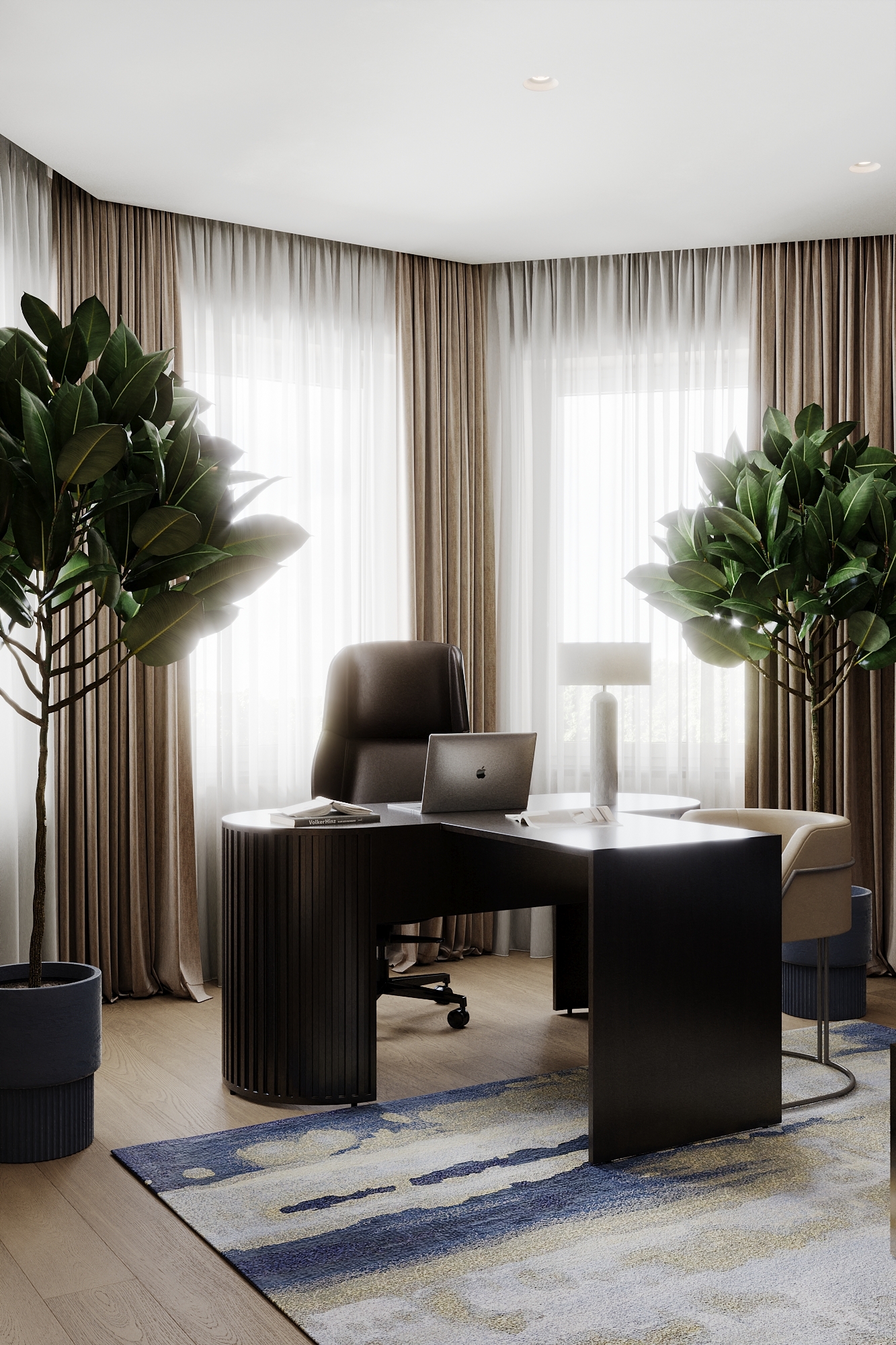Частный дом в Коломне для семейной пары, которая очень любит устраивать дома встречи с друзьями, посиделки у камина и танцевать. Для хозяина дома обустроили кабинет, он же планируется использоваться как гостевая комната. В кабинете есть эркерное окно, которое диктует нам своей геометрией расположение стола, обеспечивая и хорошую освещенность, и психологический комфорт, тк сидящий за столом будет всегда видеть кто входит в помещение, а так же общаться с гостями или членами семьи, расположившихся на диване. В гостиной разместили большой камин и диван с зоной для просмотра любимых фильмов. Для заказчиков еще очень важно было продумать именно дизайн кухни, так как функционал они уже продумали заранее и даже организовали кладовку за ней, но были сложности в том, как спрятать газовую трубу, замаскировать дверь в кладовку и как обыграть дверные проемы, ведущие из других помещений.
