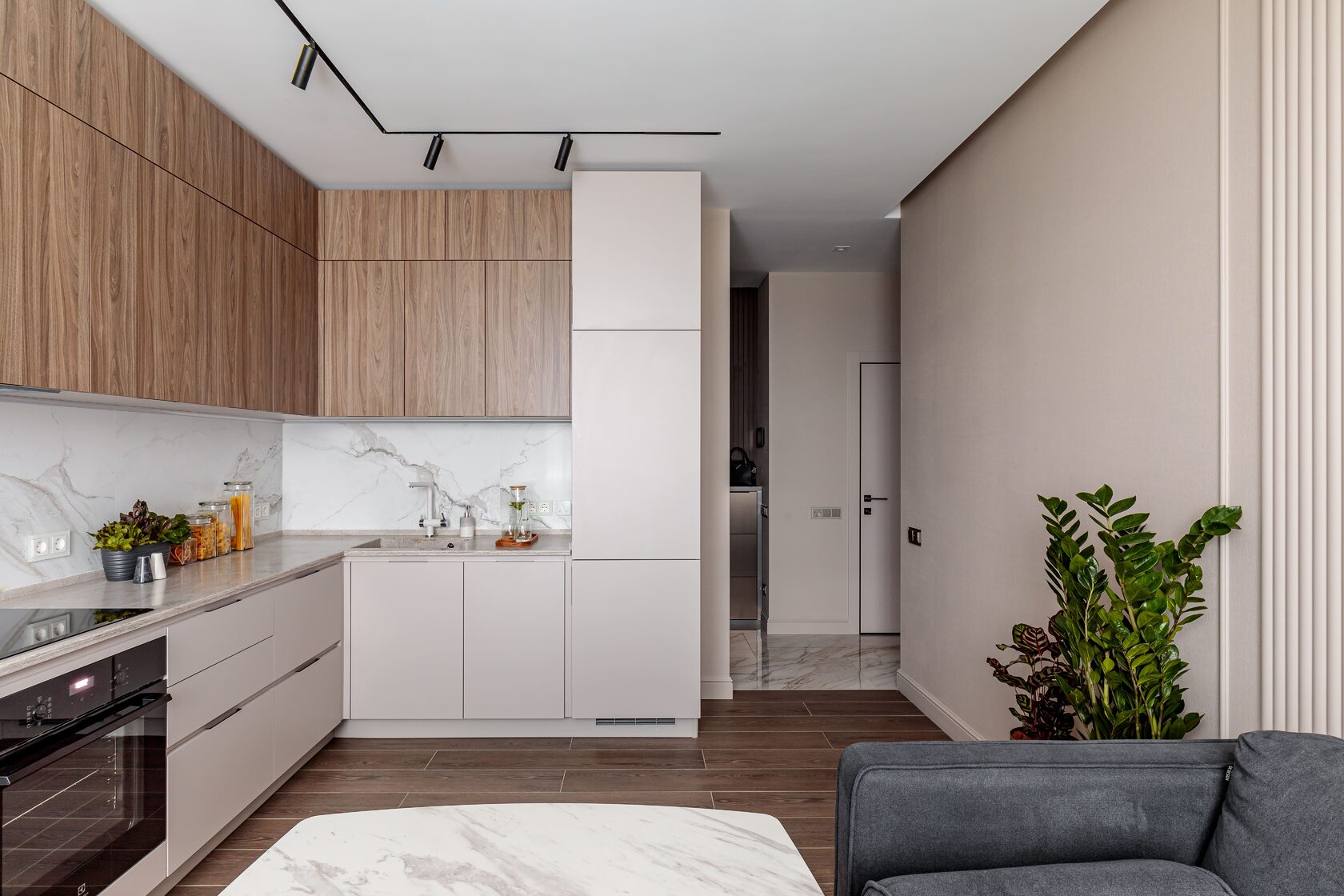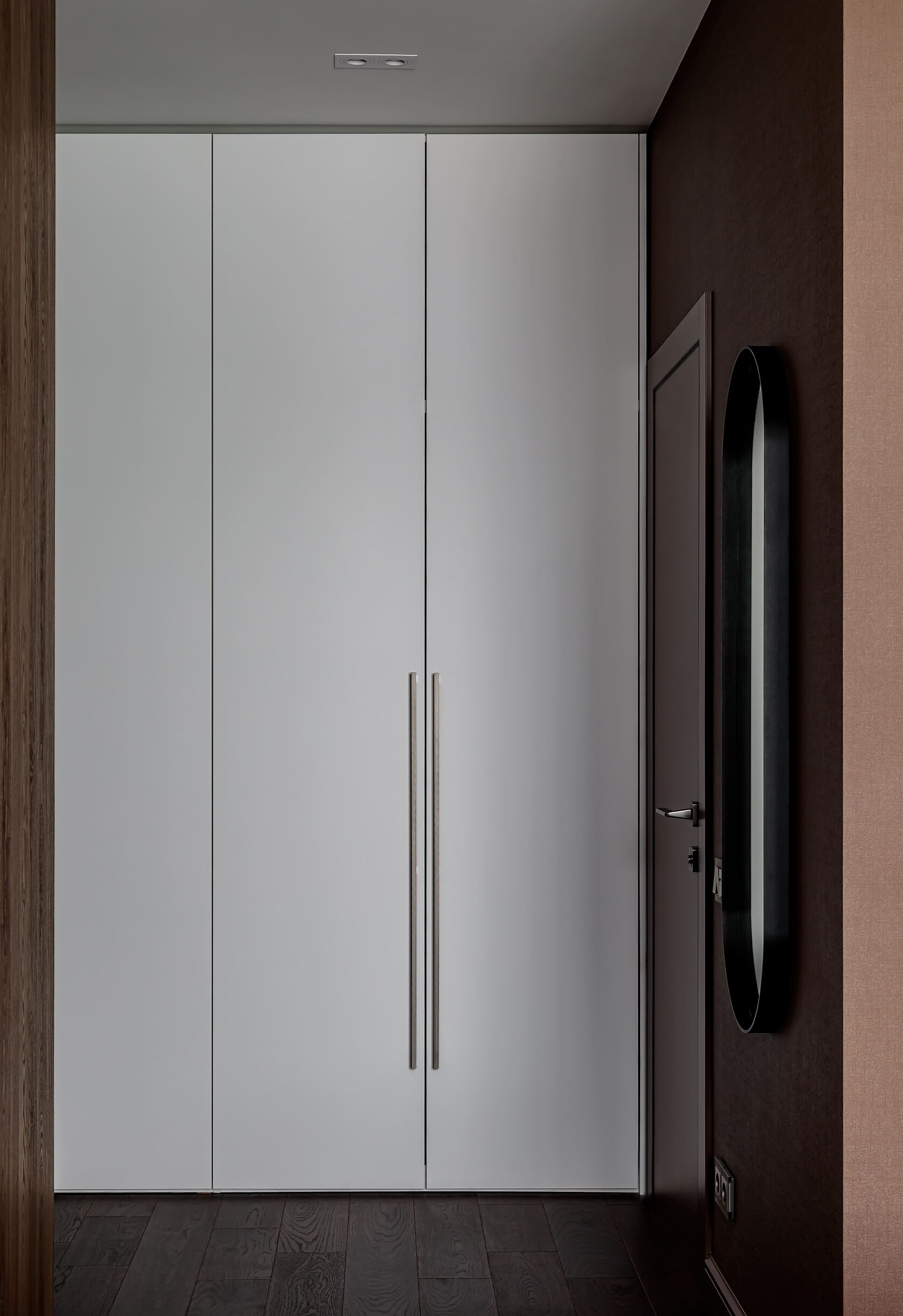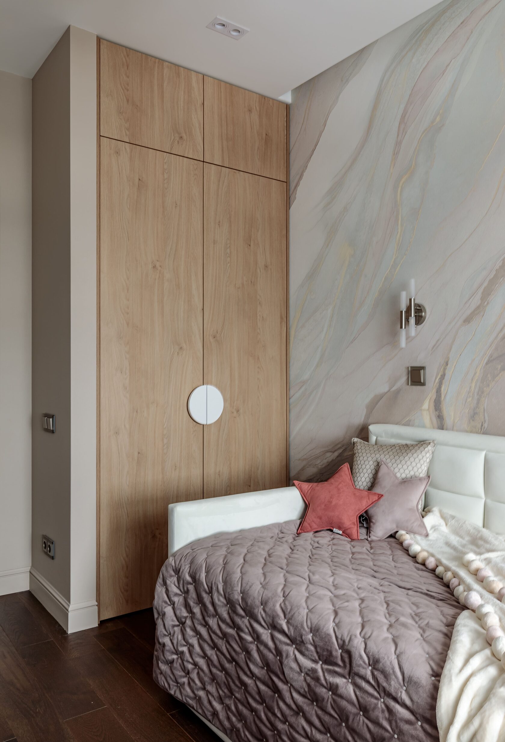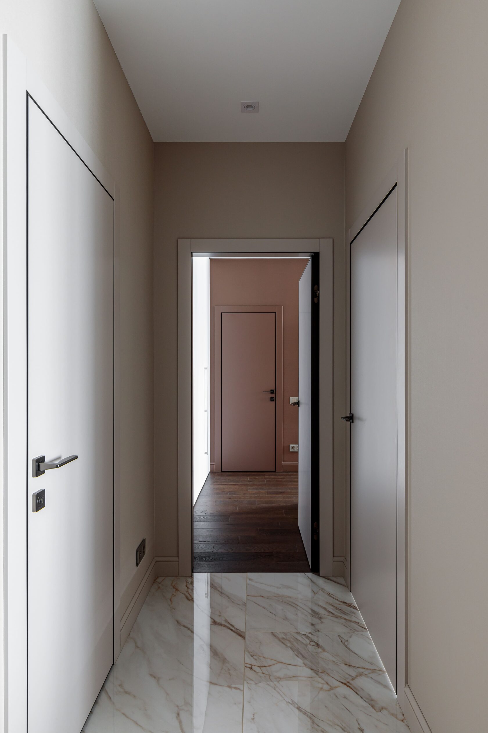 Метрополия. Квартира 65 м2 в ЖК Метрополия для семьи из 3х человек, очень ценят домашний уют и первым пожеланием было использовать в проекте нейтральную цветовую гамму, текстуры дерева в сочетании с глянцевыми поверхностями белого и черного мрамора, сохранить в квартире 2 санузла и в один из них организовать вход из спальни, а также предусмотреть большое количество шкафов и зон для хранения вещей. Семья любит собираться на кухне, поэтому там разместили диван и телевизор, чтобы можно было и отдыхать, и общаться, находясь в одном помещении. При этом у каждого есть свое личное пространство: у родителей мастер-спальня с собственным санузлом, у дочери своя детская комната.