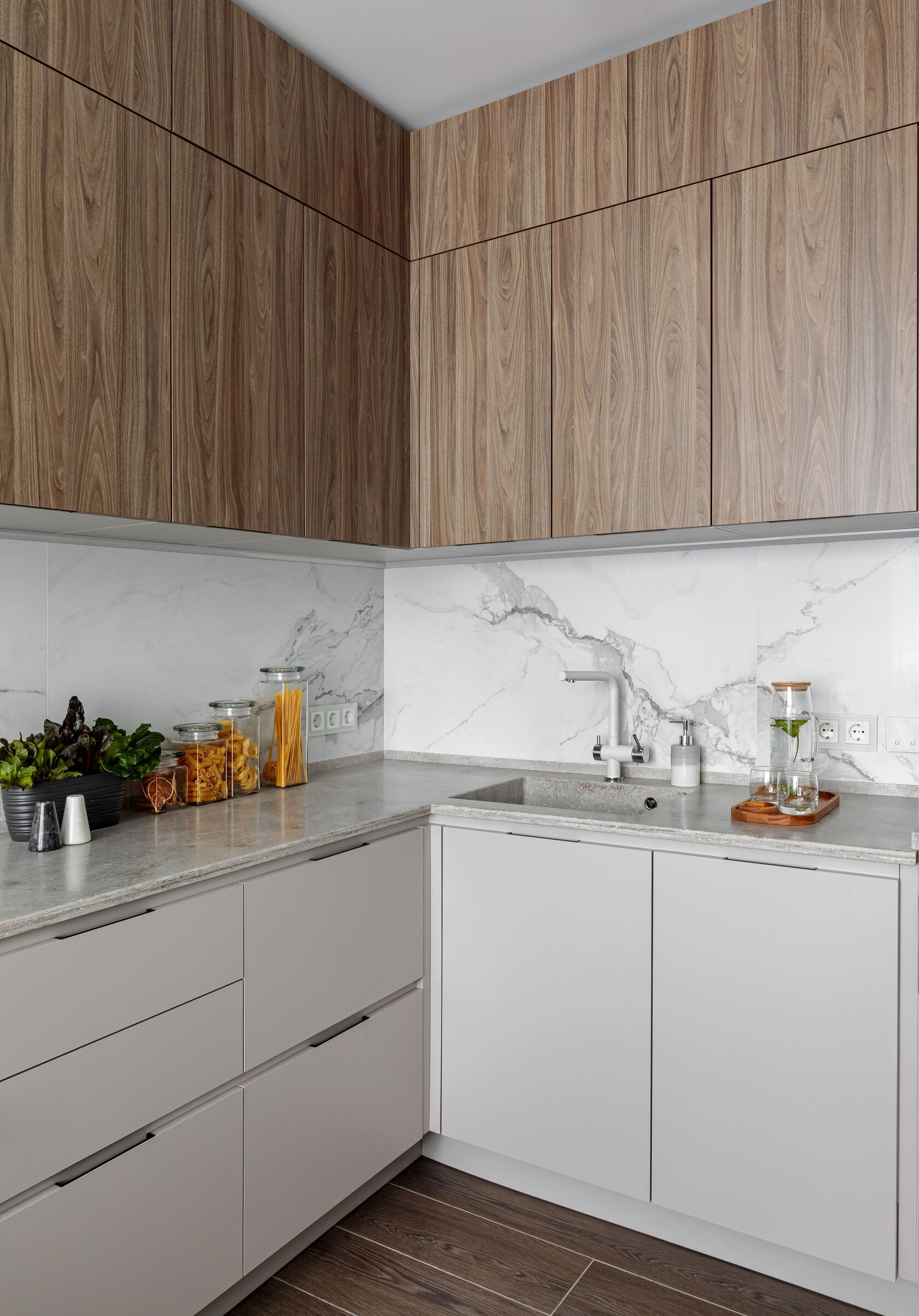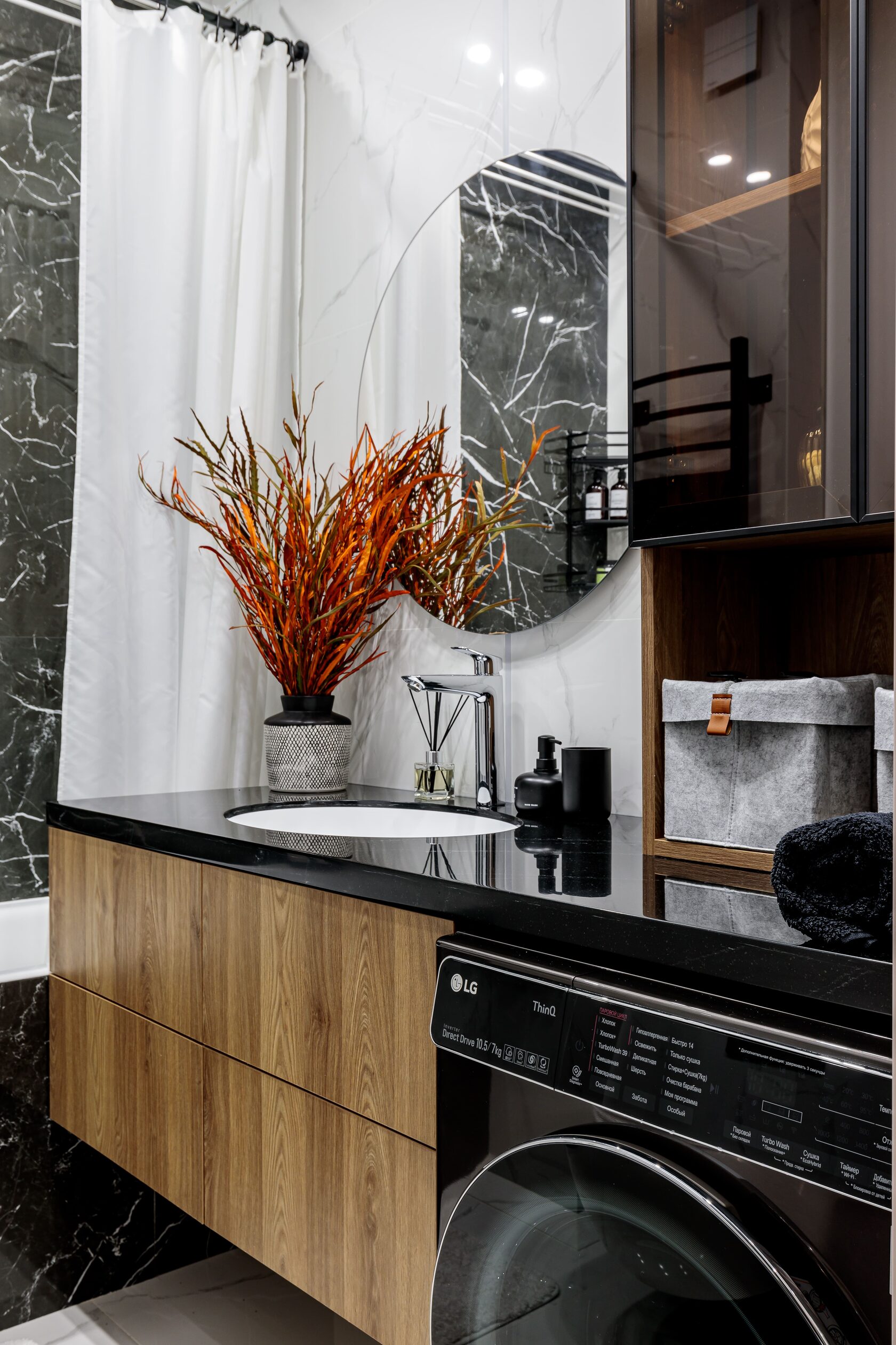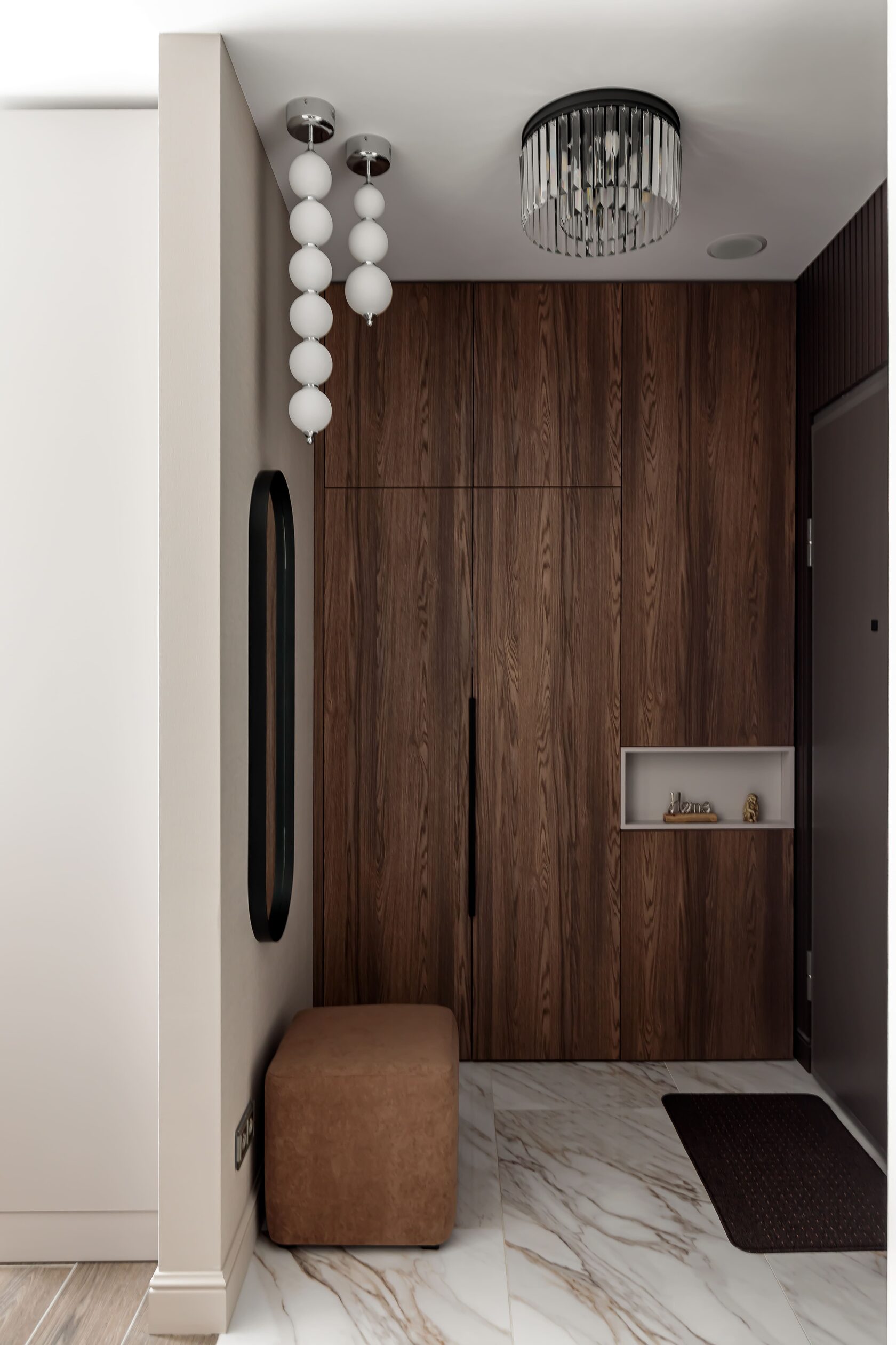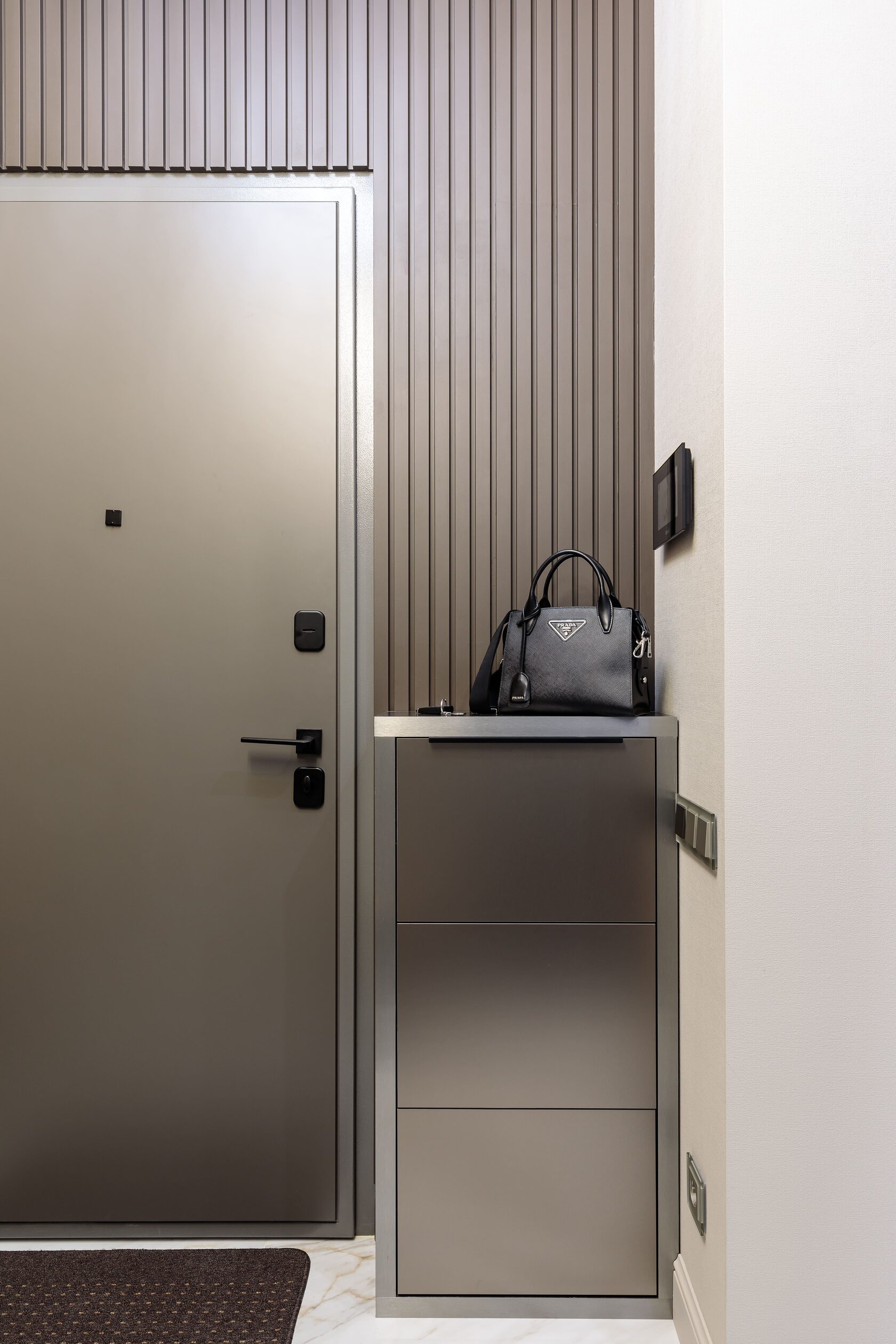 Метрополия. Квартира 65 м2 в ЖК Метрополия для семьи из 3х человек, очень ценят домашний уют и первым пожеланием было использовать в проекте нейтральную цветовую гамму, текстуры дерева в сочетании с глянцевыми поверхностями белого и черного мрамора, сохранить в квартире 2 санузла и в один из них организовать вход из спальни, а также предусмотреть большое количество шкафов и зон для хранения вещей. Семья любит собираться на кухне, поэтому там разместили диван и телевизор, чтобы можно было и отдыхать, и общаться, находясь в одном помещении. При этом у каждого есть свое личное пространство: у родителей мастер-спальня с собственным санузлом, у дочери своя детская комната.