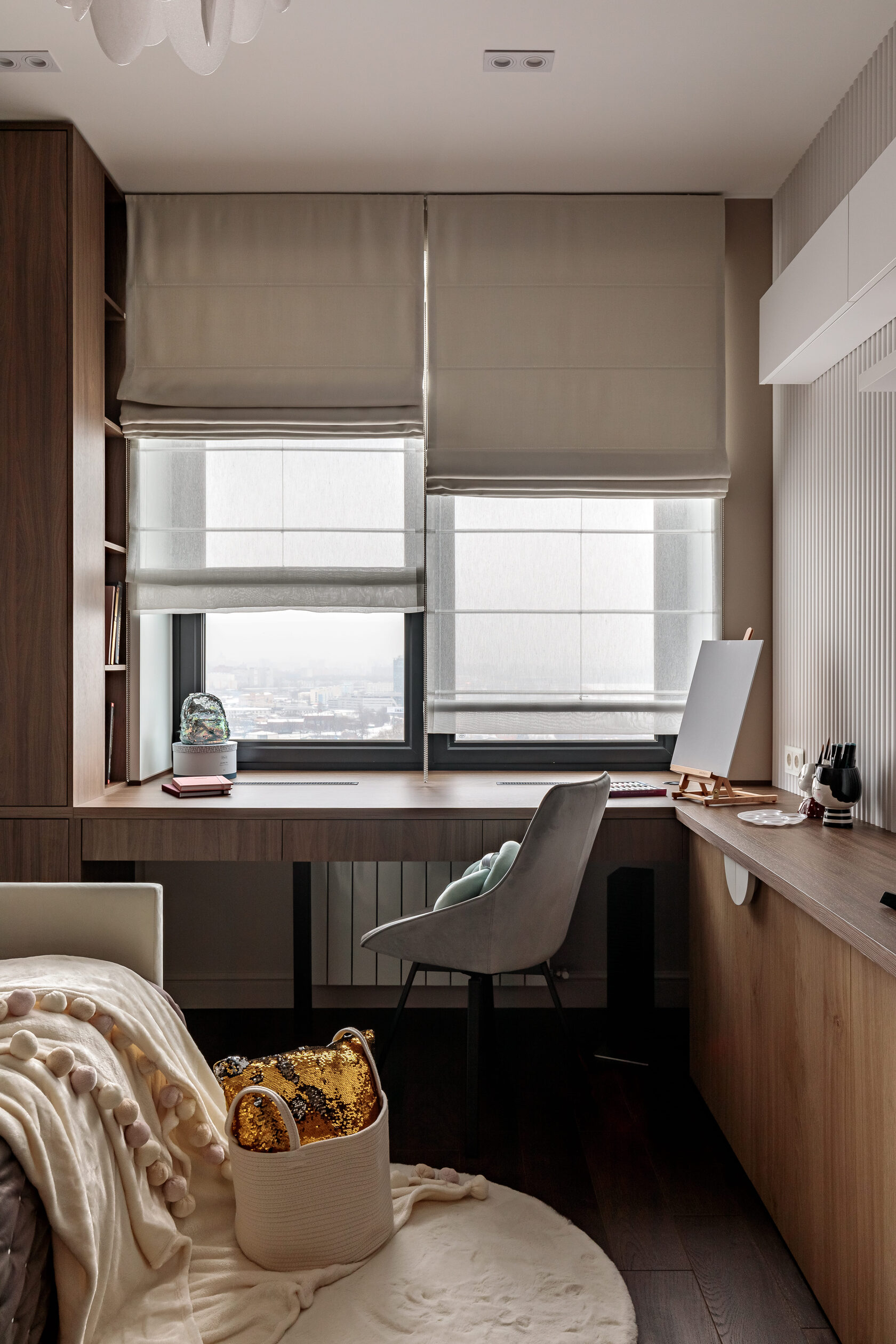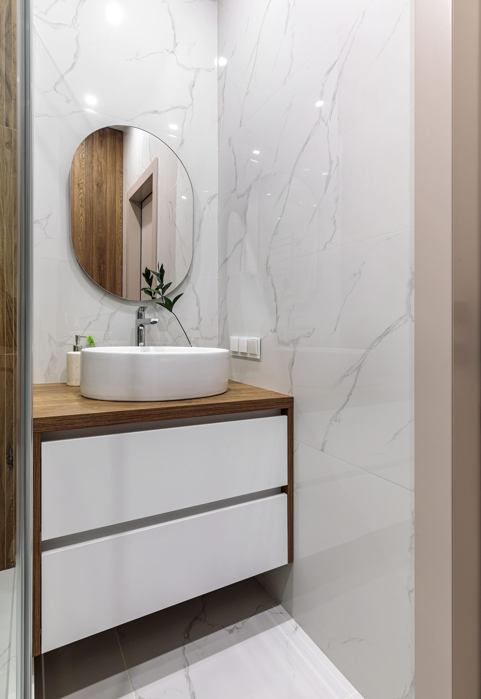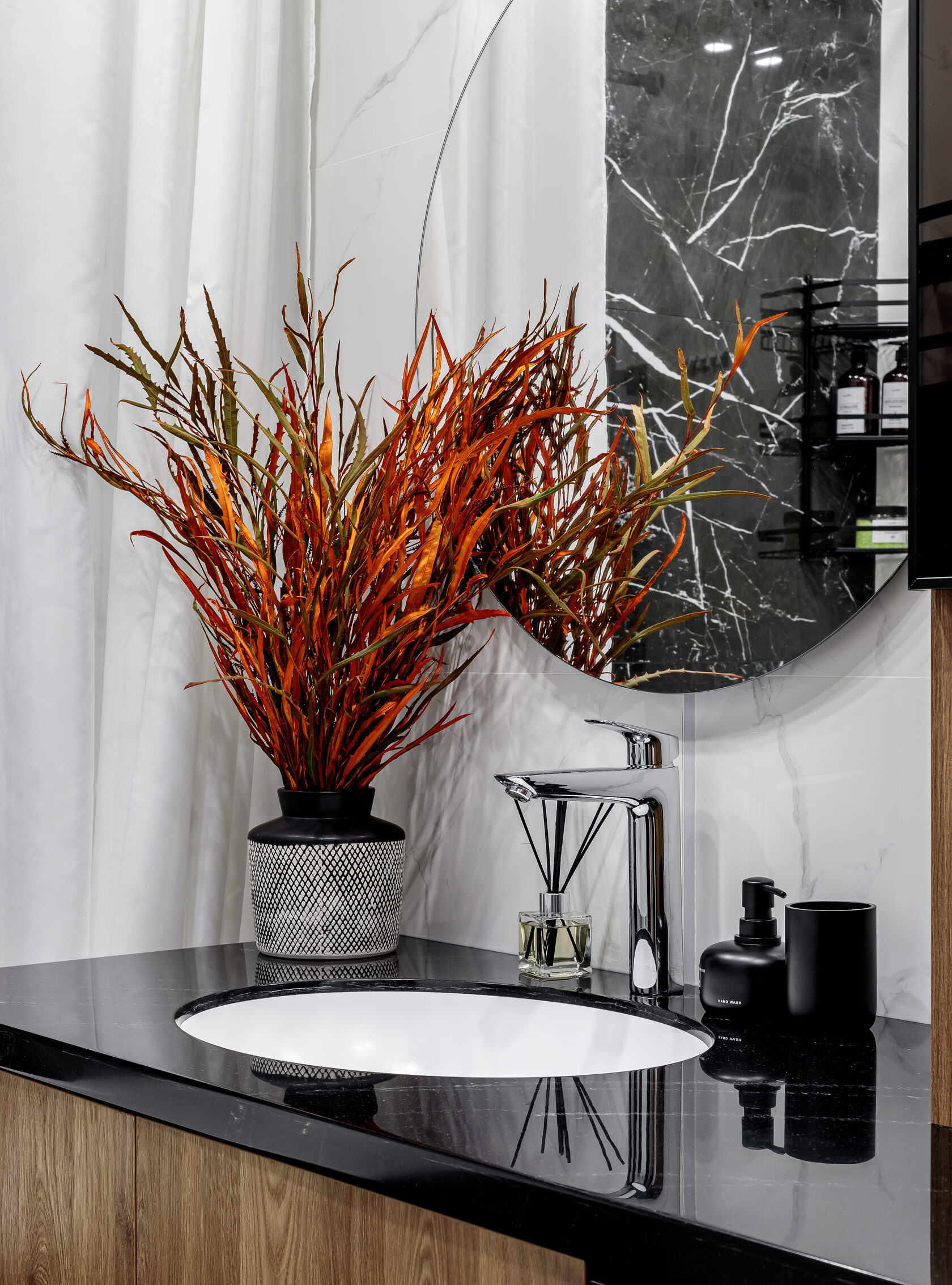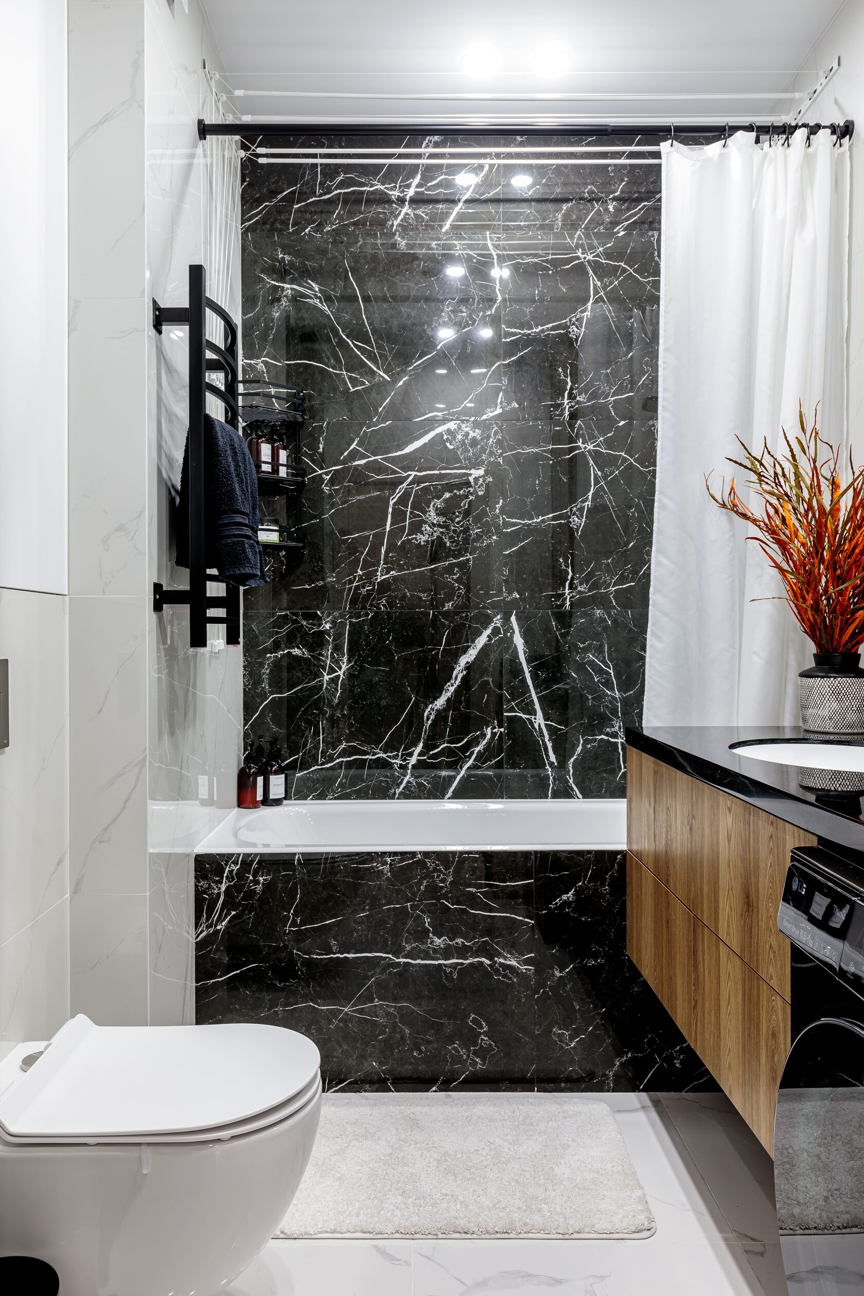 Метрополия. Квартира 65 м2 в ЖК Метрополия для семьи из 3х человек, очень ценят домашний уют и первым пожеланием было использовать в проекте нейтральную цветовую гамму, текстуры дерева в сочетании с глянцевыми поверхностями белого и черного мрамора, сохранить в квартире 2 санузла и в один из них организовать вход из спальни, а также предусмотреть большое количество шкафов и зон для хранения вещей. Семья любит собираться на кухне, поэтому там разместили диван и телевизор, чтобы можно было и отдыхать, и общаться, находясь в одном помещении. При этом у каждого есть свое личное пространство: у родителей мастер-спальня с собственным санузлом, у дочери своя детская комната.