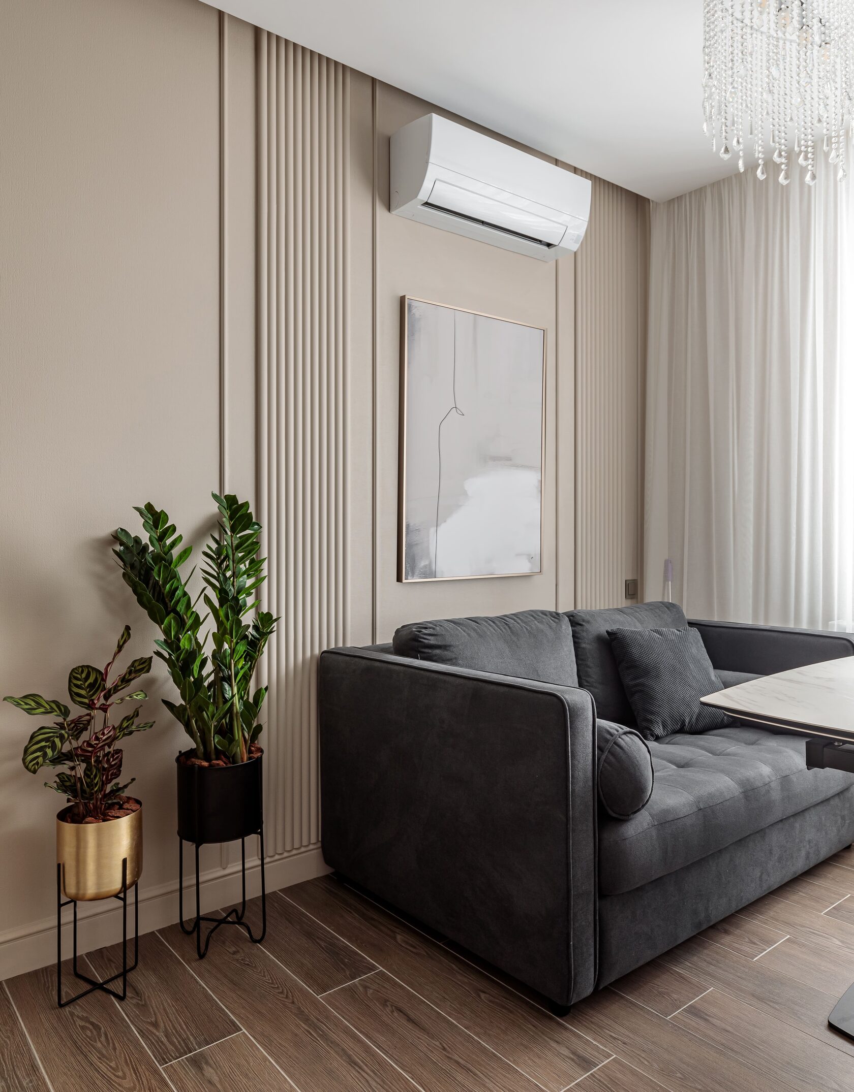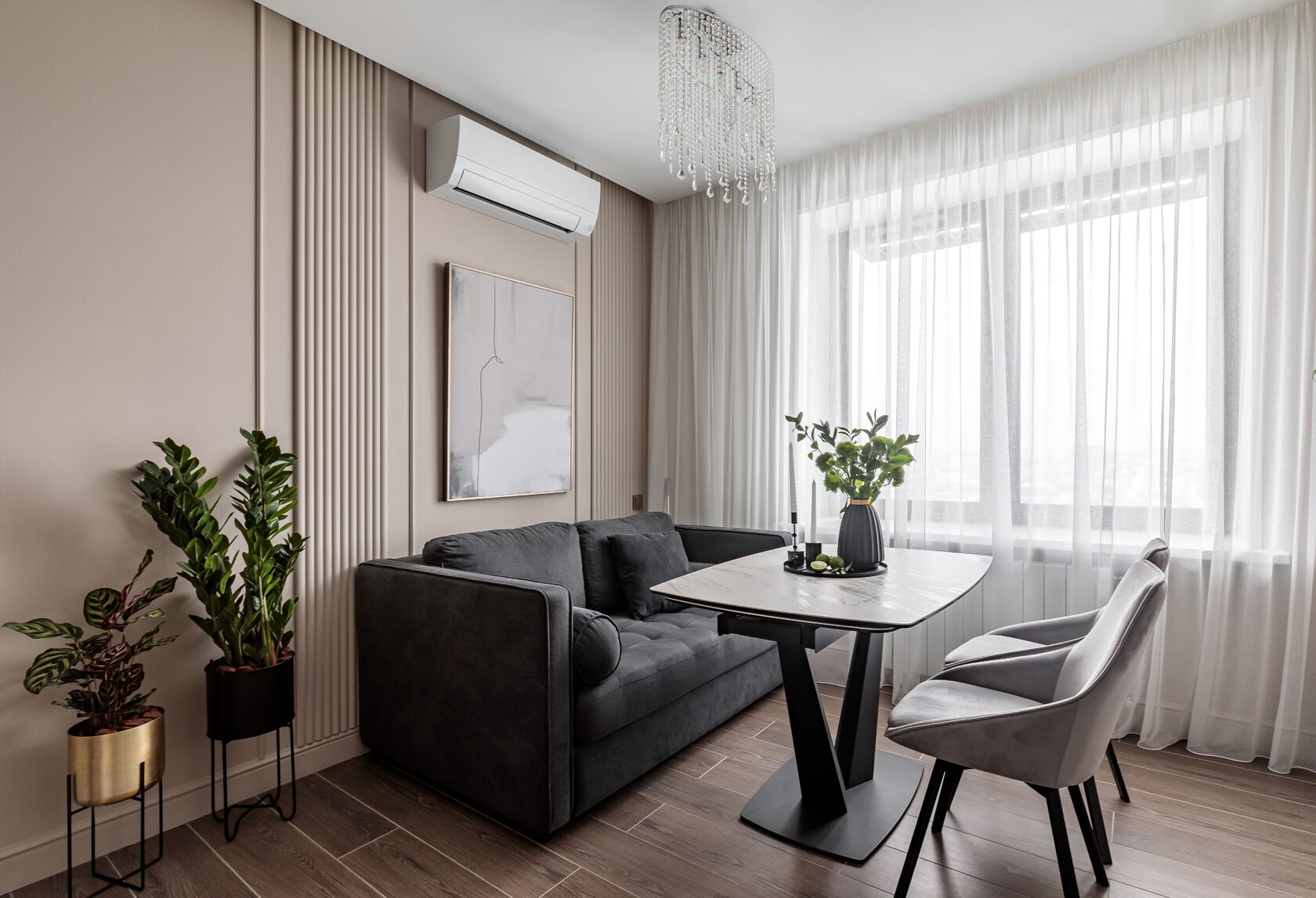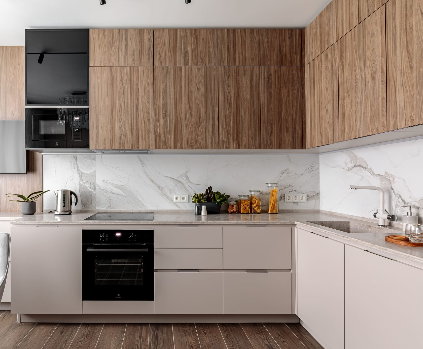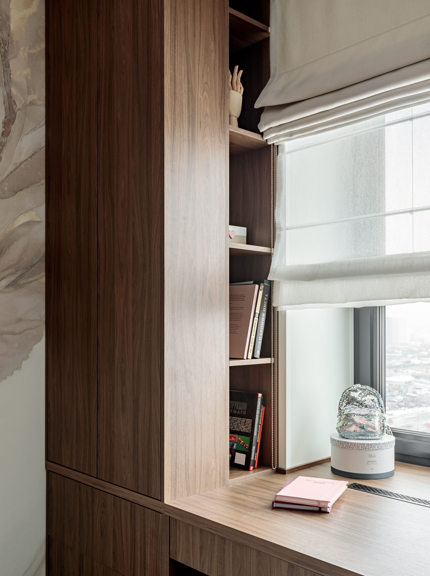 Метрополия. Квартира 65 м2 в ЖК Метрополия для семьи из 3х человек, очень ценят домашний уют и первым пожеланием было использовать в проекте нейтральную цветовую гамму, текстуры дерева в сочетании с глянцевыми поверхностями белого и черного мрамора, сохранить в квартире 2 санузла и в один из них организовать вход из спальни, а также предусмотреть большое количество шкафов и зон для хранения вещей. Семья любит собираться на кухне, поэтому там разместили диван и телевизор, чтобы можно было и отдыхать, и общаться, находясь в одном помещении. При этом у каждого есть свое личное пространство: у родителей мастер-спальня с собственным санузлом, у дочери своя детская комната.