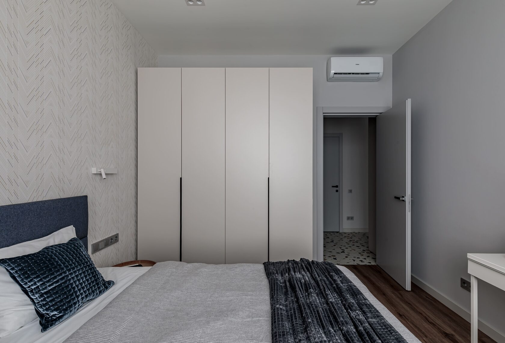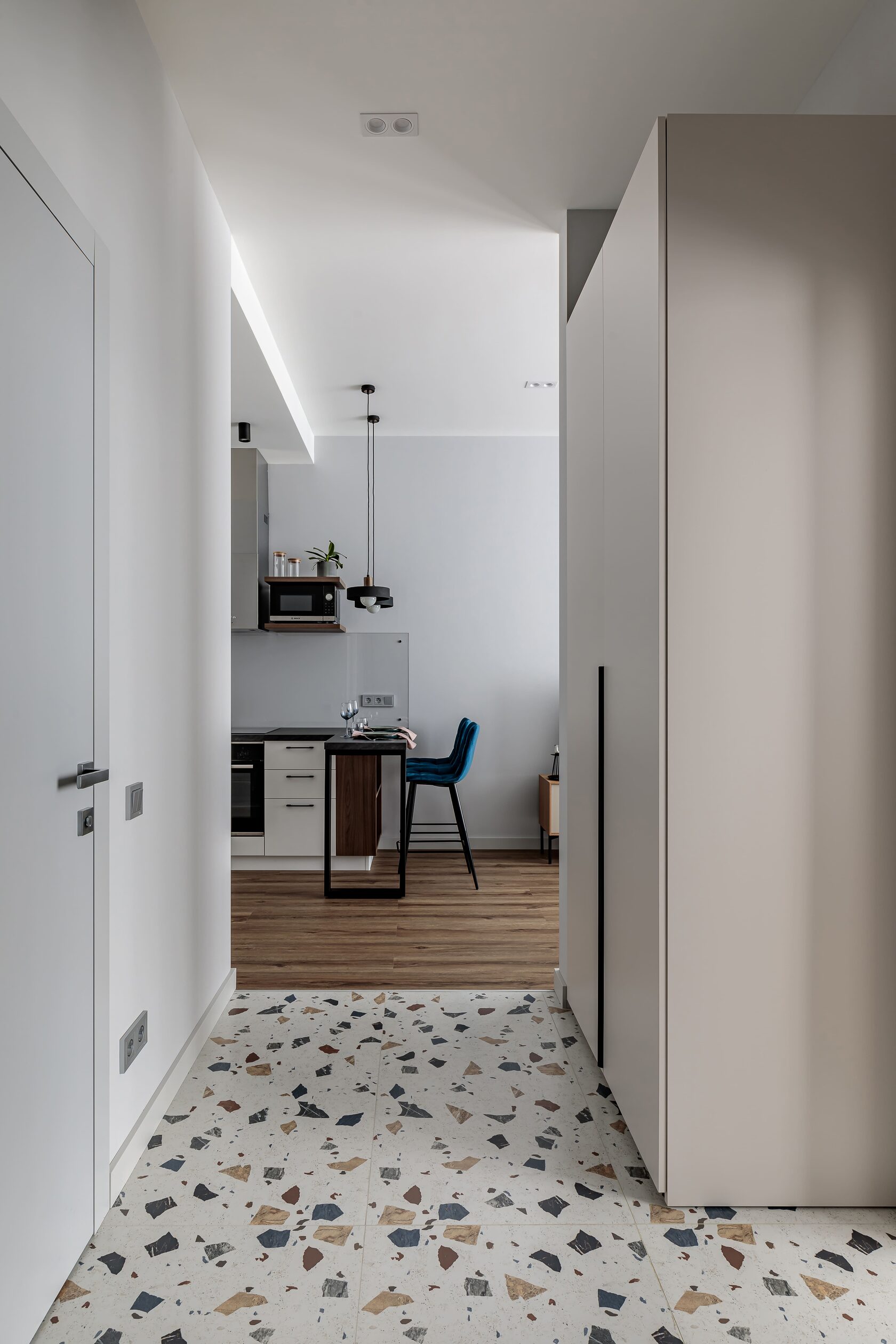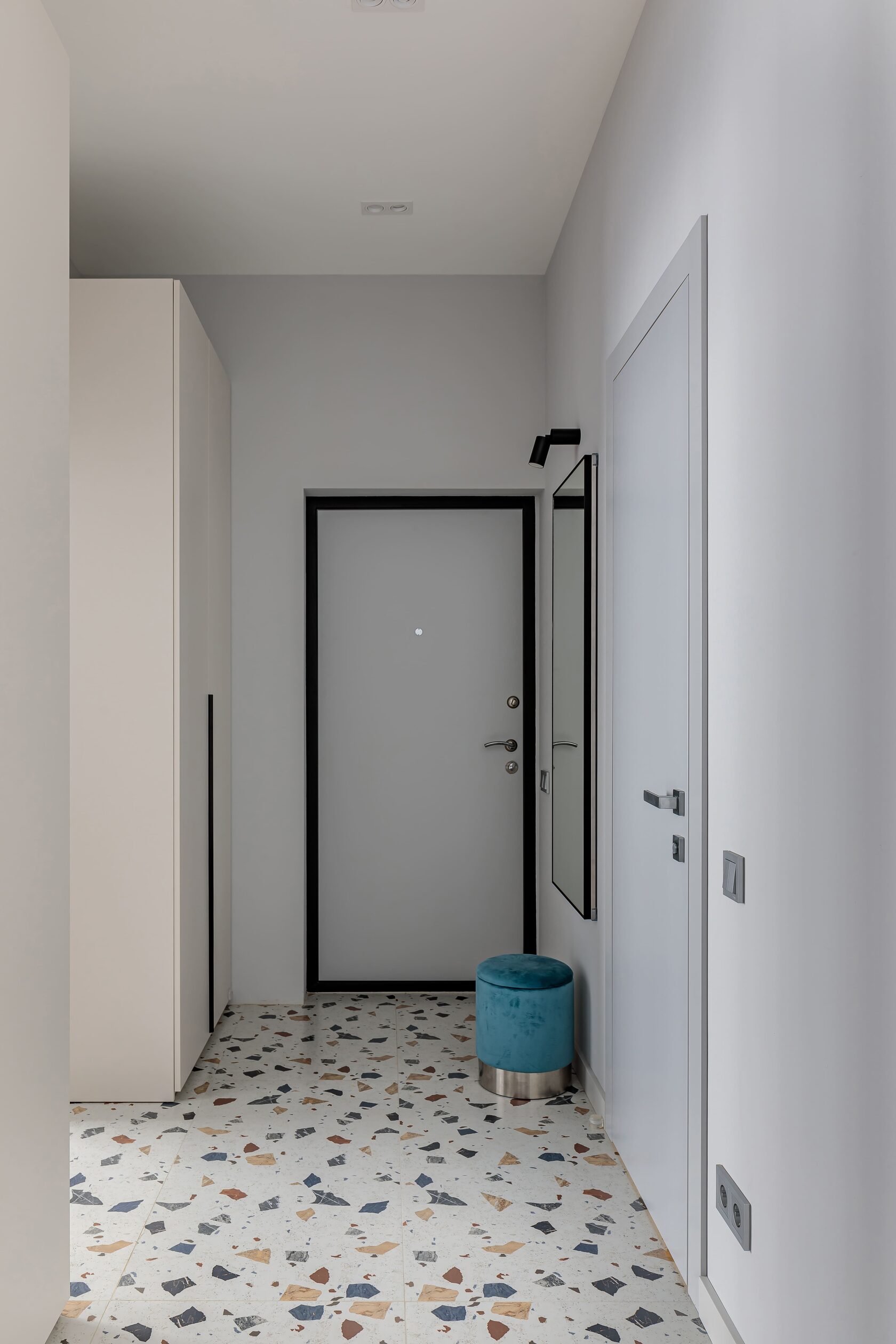 В прихожей разместились два вместительных гардеробных шкафа, внутри одного из них находится коллекторный шкаф, а за съемным навесным зеркалом мы расположили электрические щиты, за счет этих двух приемов, все технические моменты грамотно замаскированы, но при этом к ним сохраняется доступ. В квартире целенаправленно оставили много свободного пространства, для того чтобы будущие жильцы могли дополнить интерьер под свой образ жизни.