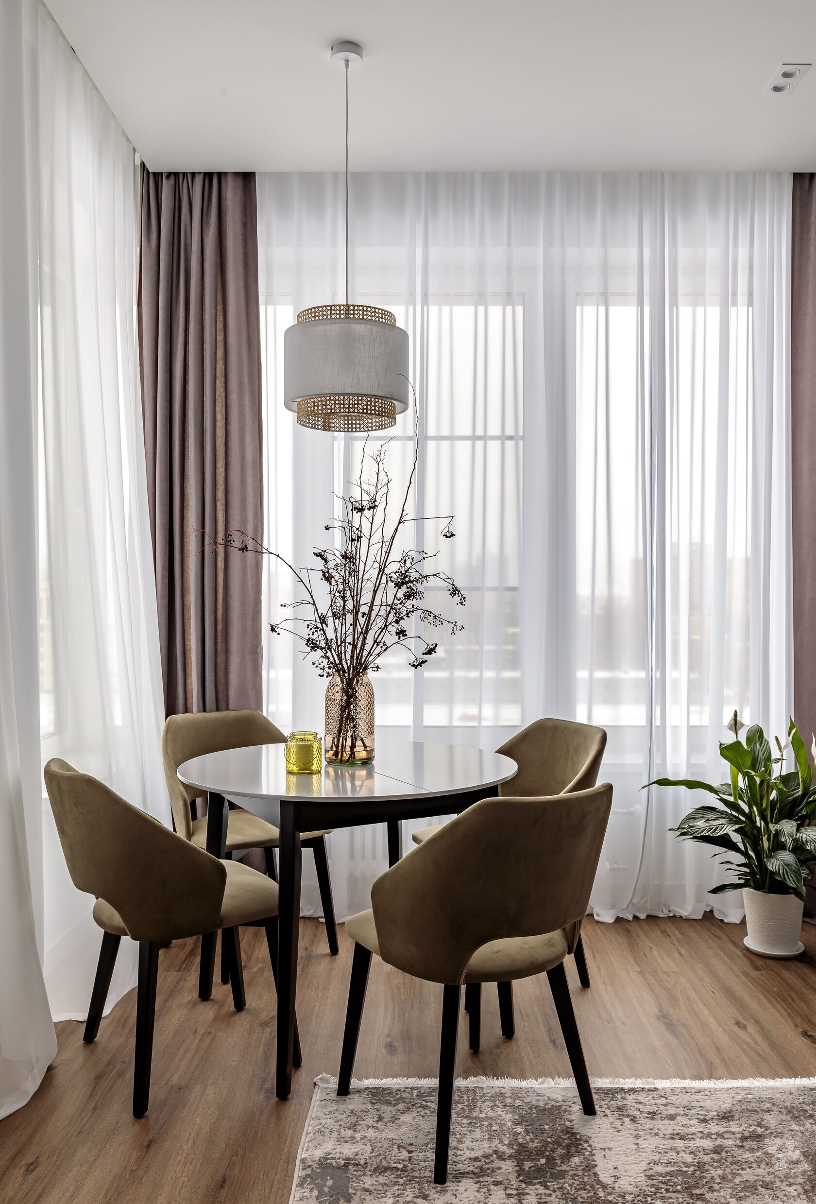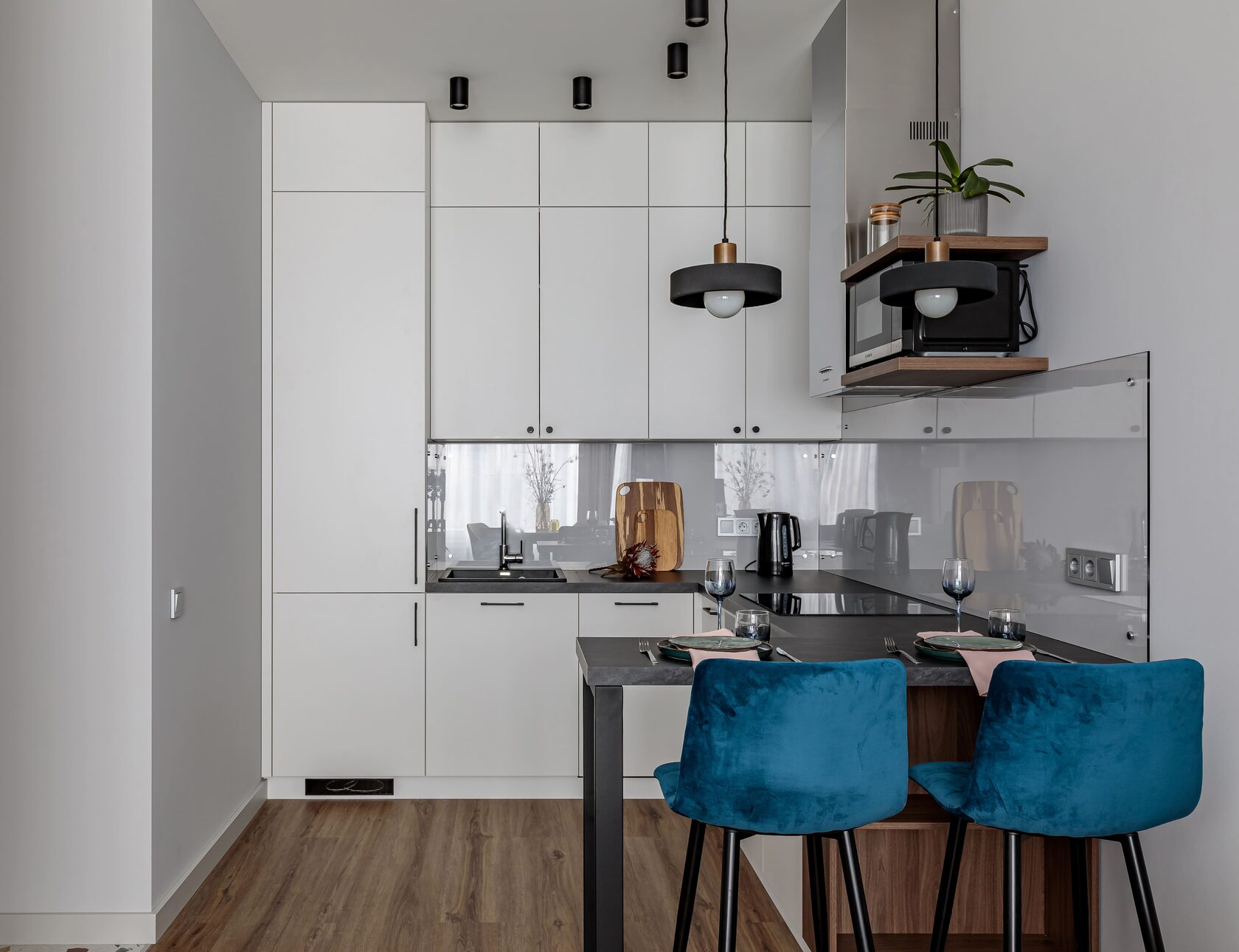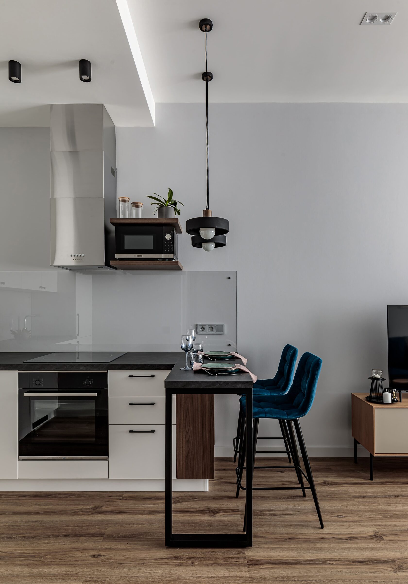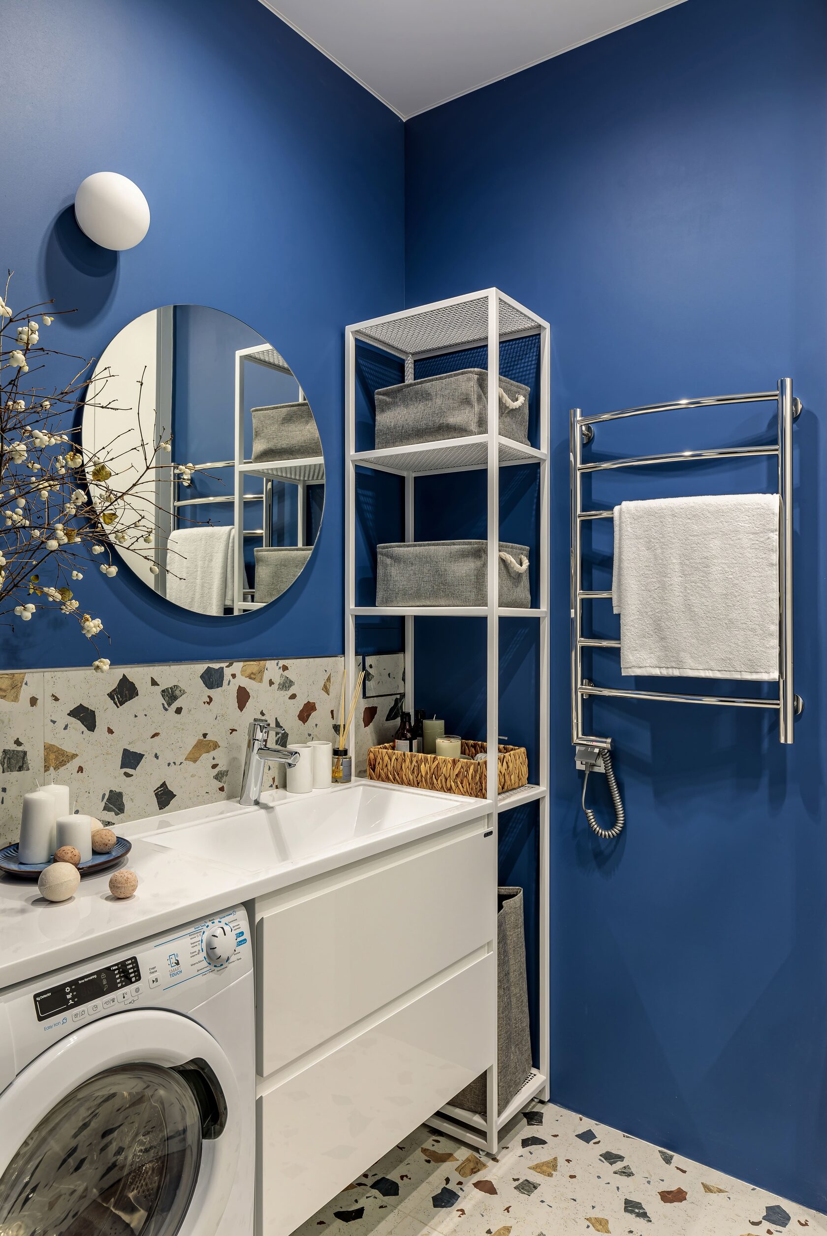 В прихожей разместились два вместительных гардеробных шкафа, внутри одного из них находится коллекторный шкаф, а за съемным навесным зеркалом мы расположили электрические щиты, за счет этих двух приемов, все технические моменты грамотно замаскированы, но при этом к ним сохраняется доступ. В квартире целенаправленно оставили много свободного пространства, для того чтобы будущие жильцы могли дополнить интерьер под свой образ жизни.
